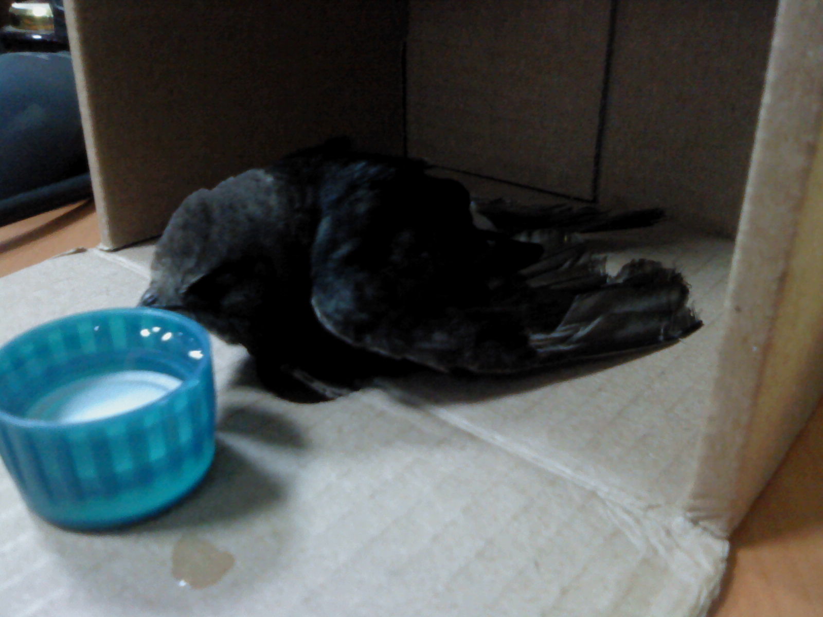 The security guard got me one and I placed the bird in it along with some water in a bottle cap, but the bird wasn’t interested. It remained motionless for a while and then attempted to take flight. Realizing that flying inside the glass building would be hazardous for the bird, I took the bird outside and tried to see if it could fly. The inside of the box was smeared with droppings. The moment I took it out of the box, it stopped struggling and nestled in my palm. It didn’t look like it could fly at all.