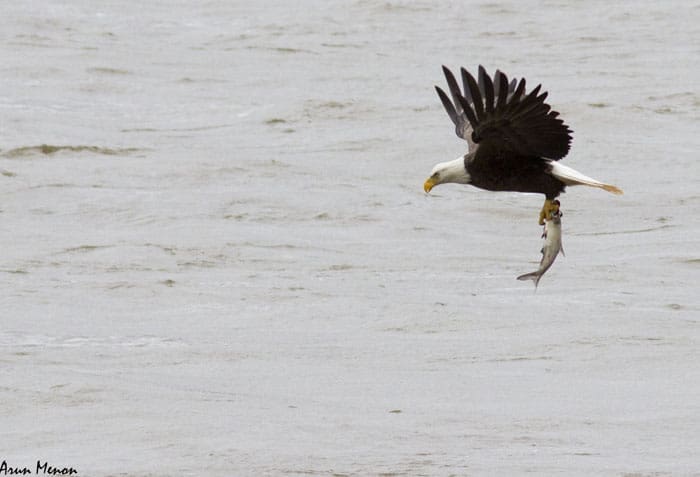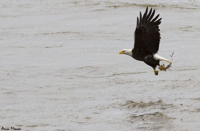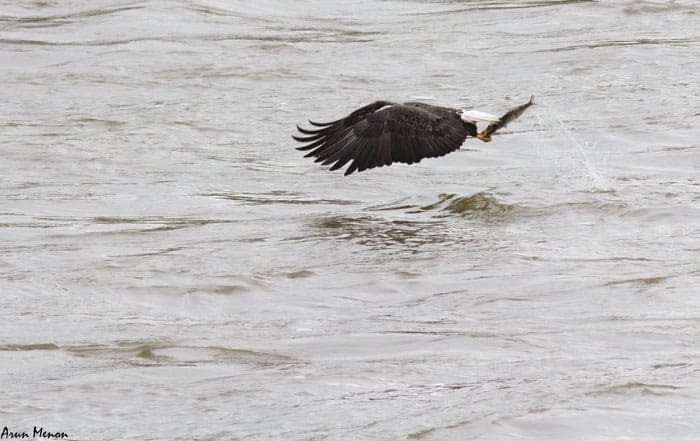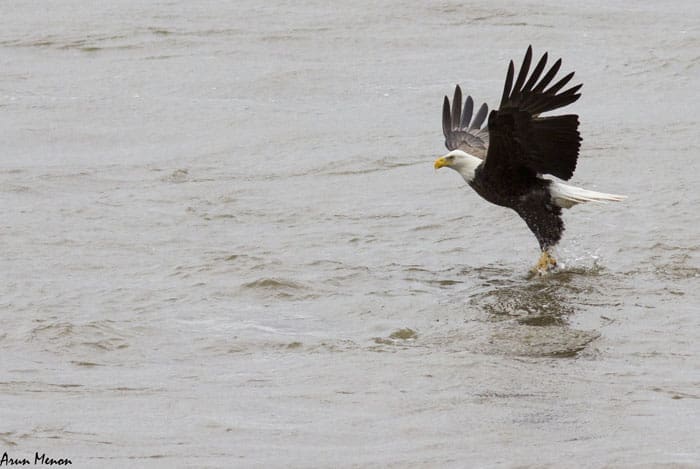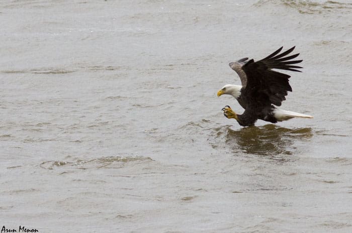Any minute calculation error on the part of the eagle can cost it a meal. The eagle may end up missing the fish entirely or the fish may slip from the talons during liftoff.