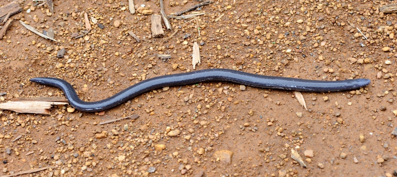 The species we were admiring was the Bombay Caecilian (Ichthyophis bombayensis), which occurs in the Western Ghats. It was nearly a metre long – I had expected caecilians to be much smaller — and the body is annulated (the skin is ringed with folds) as in worms. The two tiny eyes, barely more than dark spots sheathed by skin, are surrounded by pale white rings. This caecilian’s eyesight is perhaps limited to distinguishing between darkness and light. The mouth has rows of small teeth that are adapted for holding and cutting prey, which primarily consists of earthworms, termites and small invertebrates that live in the soil. There are two tentacles close to the mouth and this has perhaps given rise to the myth that these are venomous two-headed snakes — in Kerala they are known as iruthalamoori (literally, two-headed bullock) and killed because they are commonly mistaken for snakes (some resemble the similarly coloured shieldtail snakes).