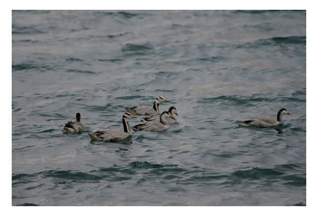 The lake, along with several other high altitude lakes and marshes of Ladakh (including the now popular Pongong Tso), is a breeding ground for this enigmatic goose whose simple diagnostic features are the black bars along the face. The first bar starts just behind its black eye giving it a very peculiar “eyeless” appearance when seen from a distance. The body is grey and it honks like rest of the goose family. The beak is yellow and the legs and feet are orange. The geese eat grasses along the lakes and are ground-nesters, laying a clutch of 3 to 7 eggs in a shallow, down-padded depression.