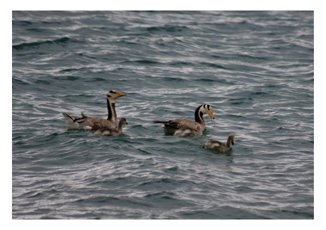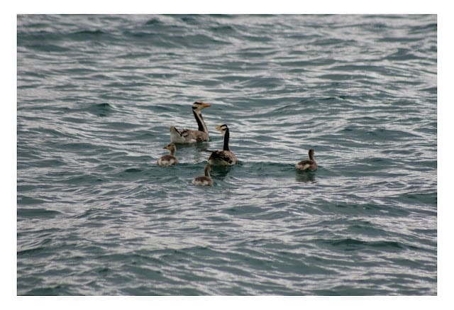 At Tso Moriri, I encountered them along the shore while walking along the lake. They saw me before I saw them and had started to walk down towards the water, chicks in tow, when I spotted them. There was no panic but they kept a watchful eye on me till they reached the lake. Then they gently swam away – a very gentle, effortless paddle, hardly appearing to move yet growing more and more distant while bobbing up and down along the wind-ruffled blue waters tinted with the silver of dawn.