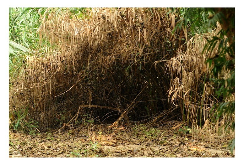 A neat nook amid reeds – thick vegetation covers it almost entirely. The Nightjar was in the small cave-like opening in the middle. |