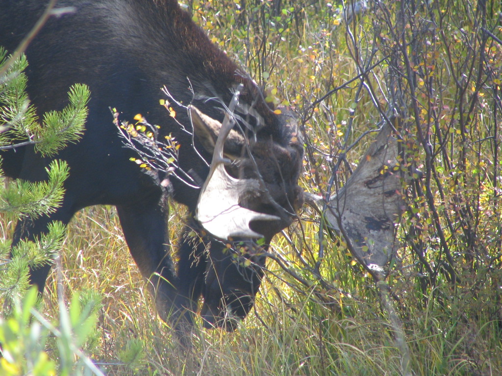 Moose rubbing its antlers against the brush signifying the beginning of the breeding season |