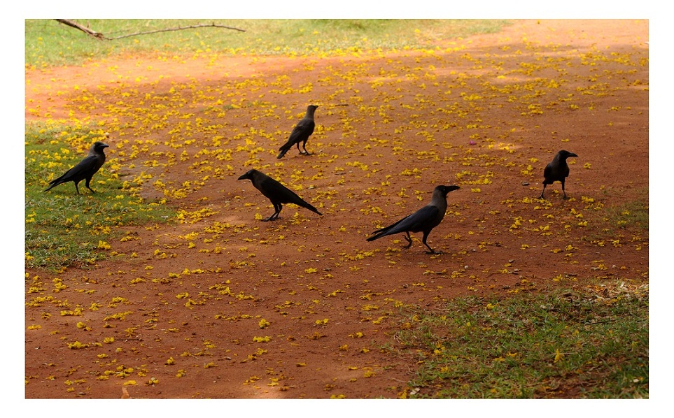 Except for the kids and the crows, everything is in a tropical stupor unless you count the constant drip of yellow flowers from the trees. The park is a virtual monoculture of the Copper Pod tree (Peltophorum pterocarpum) and they have taken cue of approaching summer to erupt in a huge flush. The trees were planted as a part of a planned effort when the park was commissioned and they have now grown huge and old. The entire place is under their canopy and the dainty yellow flowers are everywhere.