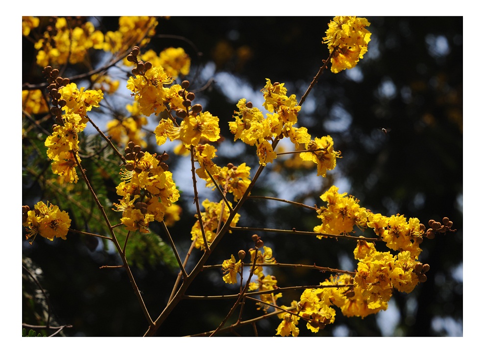 Unlike the cassias the flowers retain the bright yellow colour even when fallen and also as they dry. The tree also answers to other names like Golden Flame, Rusty Shield-bearer, Yellow Flamboyant, Yellow Flame, and is called iyalvagi in Tamil. It’s a deciduous tree and grows to 15 – 20 m in height, but is known to grow much larger. The seed pods are translucent coppery-red when young, maturing to copper and finally black – each with up to 4 seeds. The tree flowers copiously in early summer but bears flowers throughout the year, sometimes getting a second flush in September. It has a dense spreading crown and is common as a shade tree in additional to its use as an ornamental avenue tree. The leaves are small and mimosa-like and the seed is winged.