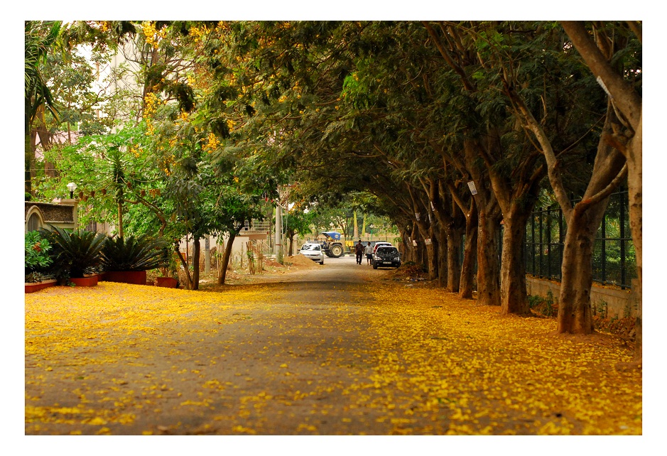 They carelessly adorn the Nandi statuette in the park’s corner, drop on incipient termite mounds (the termites do well to ignore them), cover the tops of autorickshaws on the side roads, tumble down the gnarled trunks and piling up in its crevices and fissures. They impart a yellow border to the stone slabs of the garden path and drape a yellow carpet over any space not taken by lethargic picnickers. The tree itself is not flamboyant partly since it’s not leafless when in flower – it lacks the visual grandeur of the Laburnum, Gulmohar and Flame of the Forest – but its impact on the surroundings is far more visual.