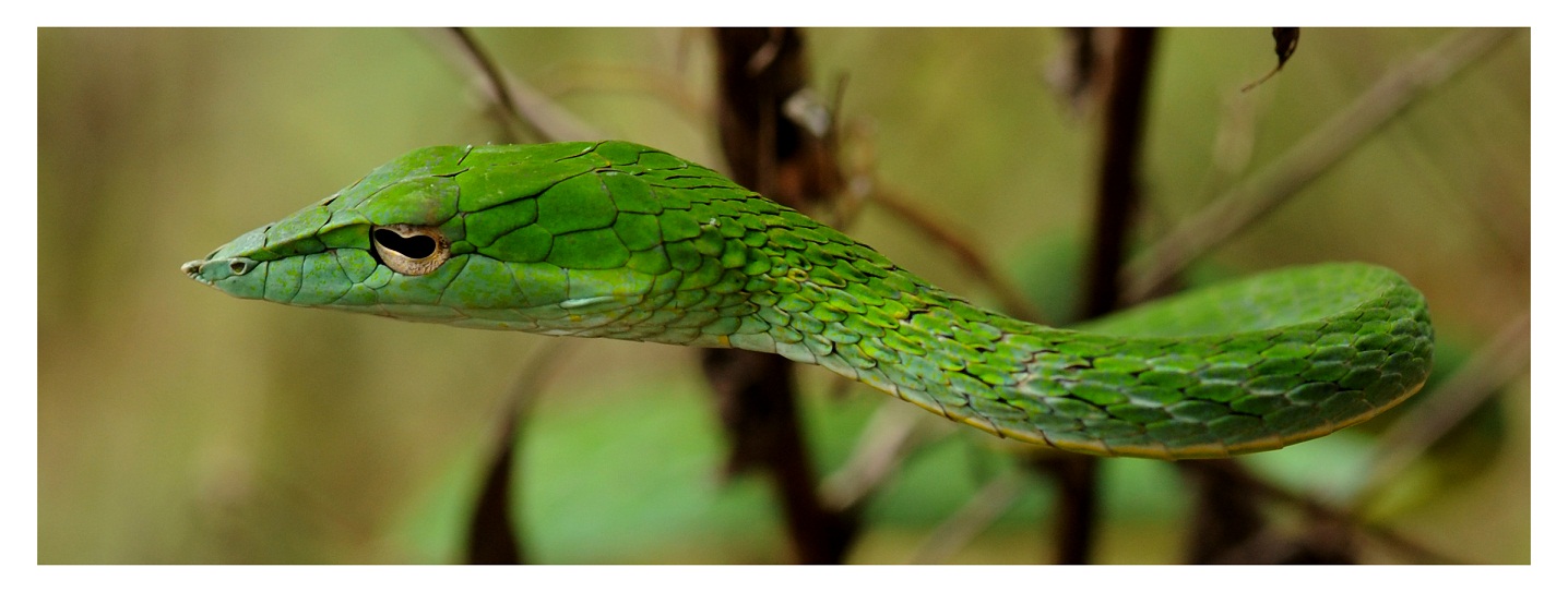 The forward-facing eyes, which enable binocular vision, help the snake judge depth and distance, which are necessary to sustain its arboreal lifestyle. The snake’s eyes and pointed snout have also led to myths that it plucks out the eyes of its adversaries. Curiously, J C Daniel has recorded that the Vine Snake has the “habit of striking the eye of its opponent, the only object in movement in a tree snake’s view” and adds that the snake’s common name in Tamil means “eye-pecking snake”.