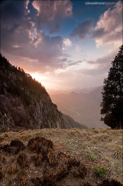 Charan has disappeared but soon turns up again. He had gone to a ledge further ahead, and informs us that we are in mobile phone network there. All of us head there to make a few quick calls and get more than what we bargained for. Right ahead of the ridge is a steep cliff, and beyond that lies rows after rows of mountains. We can see a few villages down in the valley (using our binoculars). Dusk is falling and the sky is painted gold.