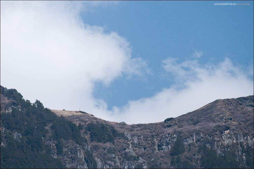 We start early, in order to spend some time at Jogni. No wildlife sightings even today. Charan catches up and we start descending. Within five minutes, I start wishing that I had parasailed down instead. The trail is treacherous. It is steep, slippery due to the frost, and shit scary. We are descending a very steep wall of a mountain, the incline at times as much as 65 to 70 degrees. I stuff my camera into my bag to have my hands free and grab a long stave for support. We see a dazzling Golden Bush Robin (Tarsiger chrysaeus) flitting around the rhododendrons — our last spotting atop Jogni.