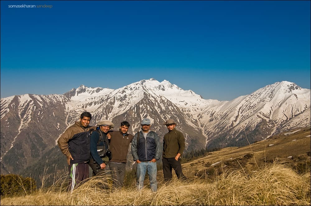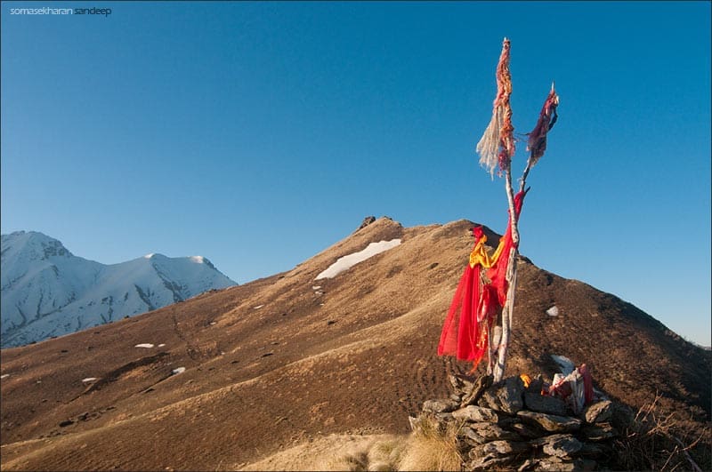 By the time we reach the top of the meadow above the hut, it is already past seven and we see absolutely no mammalian life. We wander around, seeing some bird life, but that is no consolation for we were expecting goral, bharal (mountain goats and sheep, respectively) or bears (brown and black) that are common in these parts. A Eurasian cuckoo (Cuculus canorus) sits atop a high tree and utters intermittent calls similar to the old cuckoo clock. This point, Charan tells us, is called Jogni and there are tiny makeshift shrines around, with all kinds of offerings strewn around — bangles, muddied tenners lying exposed to the elements since time immemorial, pieces of silk, and scrap metal. From that lofty ridge, if you look north and north-east, you find a formidable wall of snow-capped peaks. In any other direction you glance, all we see are layers after layers after layers of mountains.