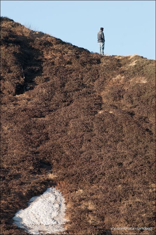 At around four, I and Arun see a couple of crows glide past overhead. The cry, though, is much less harsh. We quickly pick up our binoculars and find that the bills are yellow – which makes the bird a Yellow-billed chough (Pyrrhocorax graculus). We climb up Jogni once more, and get some ‘record’ shots of each other in the evening light.
