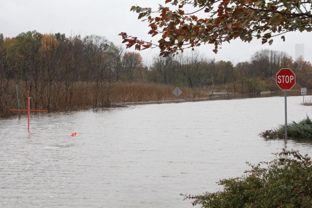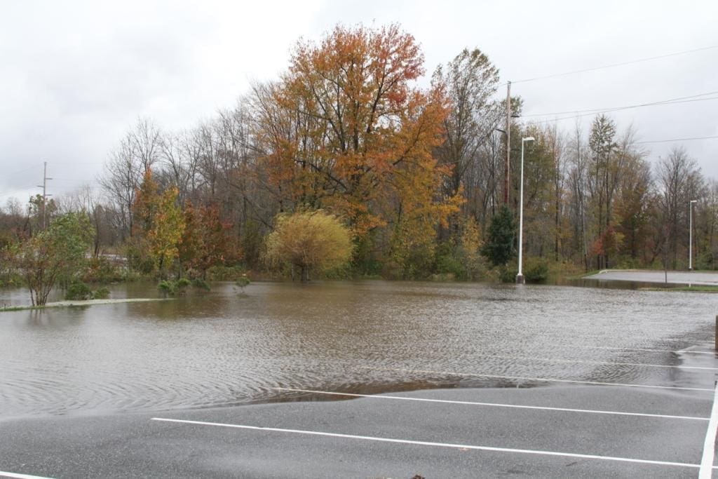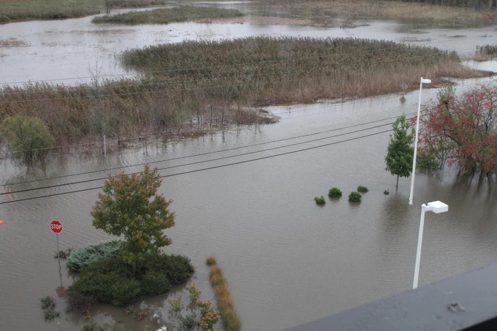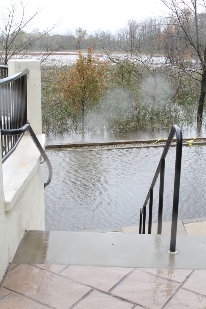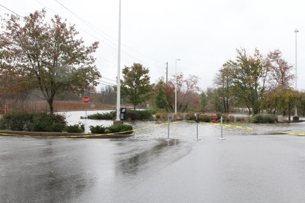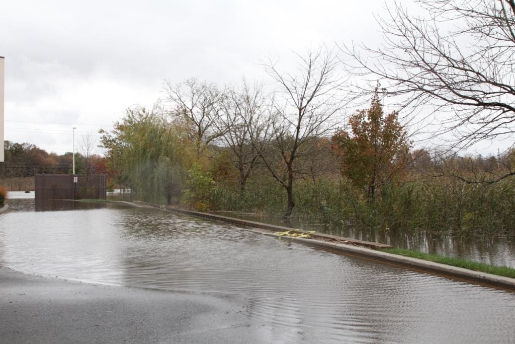 Tuesday early morning, around 4:45, I got a call from the hotel front-desk. In half-sleep I answered. The voice at the other end said, “Sir, we need to move your car.” Walking to the parking lot, I found the car in almost a foot of water. The flooding was getting serious. Now, Sandy had my attention. The water I had to walk through, to reach the car was ice-cold. More than 12 hours later, as I write this, my feet have not completely recovered from that temperature shock. Later on Tuesday morning I realized that the flooding was worse than I had expected. The hotel driveway and the road were completely flooded. Although I was stranded at the hotel, I took a couple of pictures the scene. Here they are: