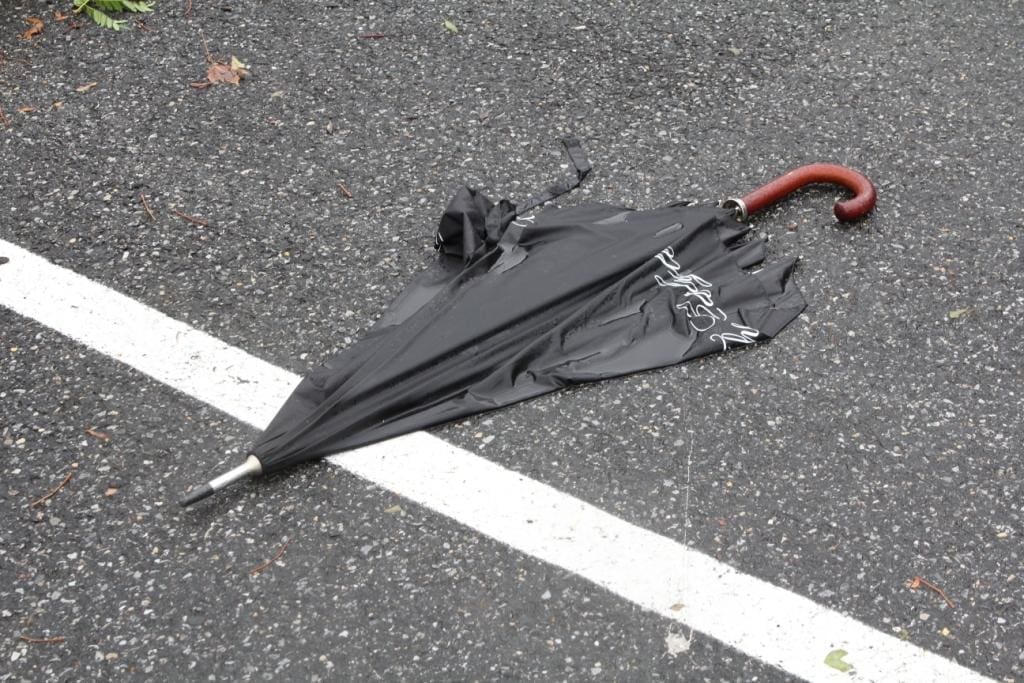 An abandoned umbrella. An umbrella is designed to be effective if the rain hits you from over your head. What do you do if it hits you horizontally?