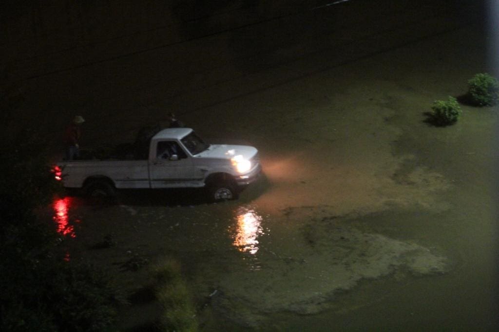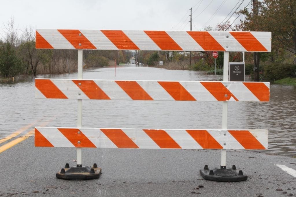 Flooded road in front of the hotel. The 3 foot tall orange warning cone is almost completely submerged.
