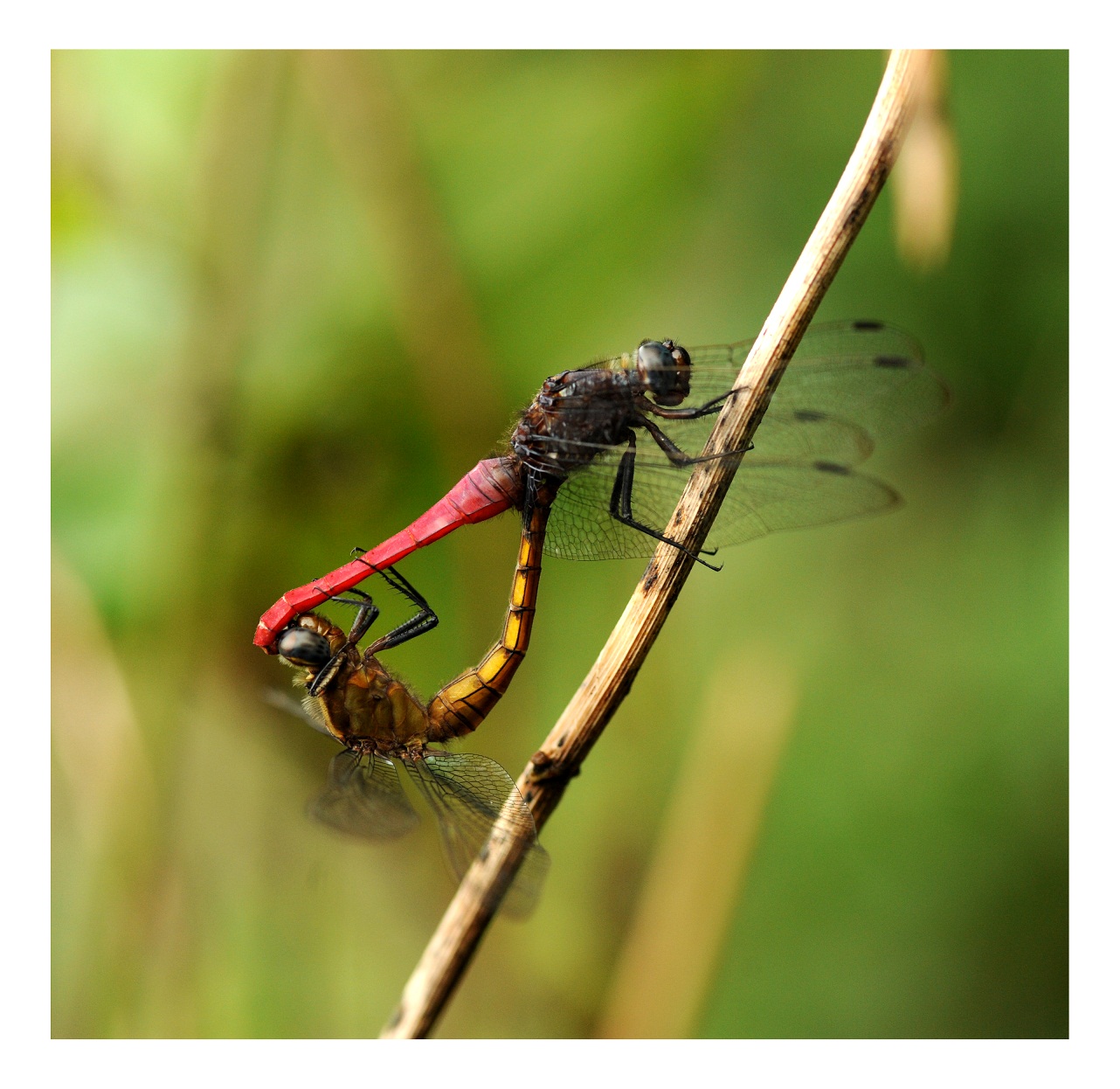 Crimson-tailed Marsh Hawks form little earthly arcs as they clasp. Often, when mating dragonflies take wing together, they resemble some large composite monster |