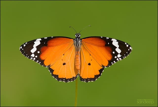 The Plain Tiger Butterfly (Danaus chrysippus) carries all the glory of a tiger. The bright orange wings are often left spread flaunting their brilliance, and the butterfly can be identified by its nonchalant flutter. It is the friendliest for a butterfly lover to start with, and we shall soon find out why…