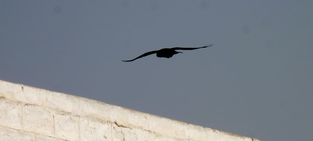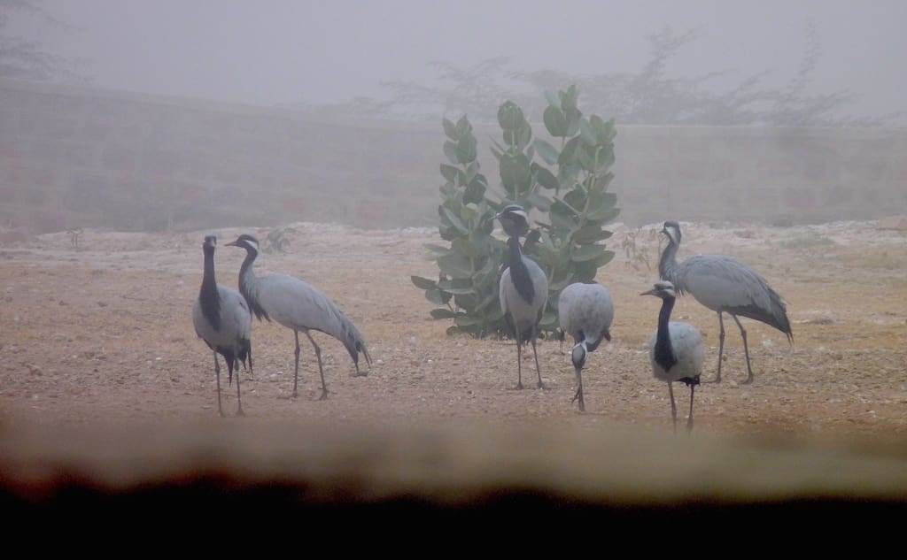 Wheatears and Western Grey Shrikes flit among the thorn shrubbery. Desert Jirds peek out of their subterranean hideouts, munching and chomping as if grass was going out of fashion. Raptors soar over the land, seeking prey. There are eagles and buzzards, kites and falcons. Eurasian Griffons and Cinerous Vultures — rare anywhere else in the country — circle in the sky. A small band of Demoiselle cranes joins them. Out of the unknown a Common Raven, black as Poe’s poetry, visits but does not stay.