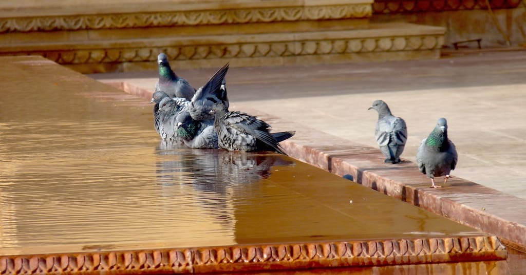 Feral Pigeons enjoy a splash. I looked eagerly for the Yellow-eyed Pigeon