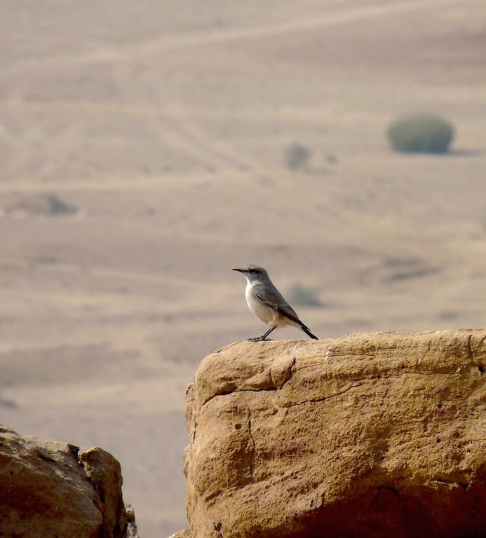 An Isabelline Wheatear against the dramatic desert landscape