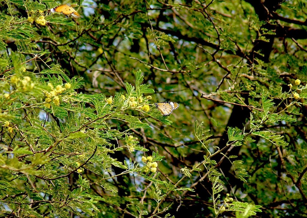 A butterfly feeds on nectar from the blossoms of a Khejri tree (Prosopis cineraria)