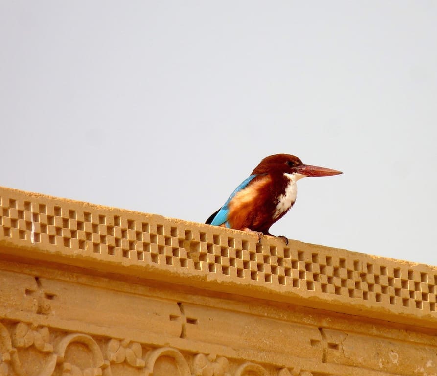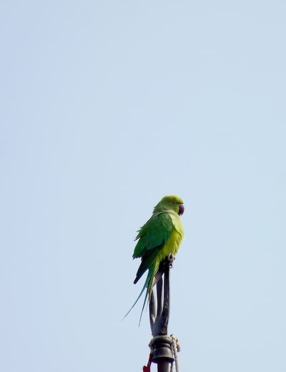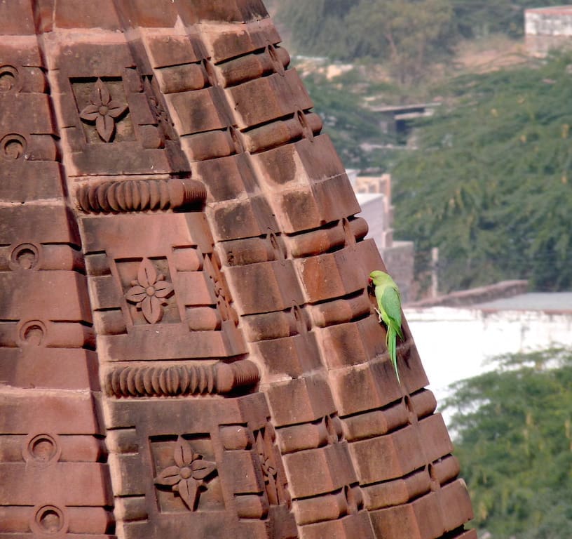 A Rose-ringed Parakeet makes itself at home upon Osian’s red sandstone monuments