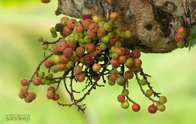Fig trees (Ficus sp) are valuable sources of food for many birds and animals. In an age when fruit trees have turned into cash crops restricted to orchards, with guards stationed to keep birds away, these trees, which provide tiny fruits that ripen to a rich red and house thousands of tiny seeds, become life-givers for birds and mammals. When they are not fruiting, the trees’ thick canopies provide safe haven for several species. When the fruits ripen you can hear the clamour of a hundred birds feasting from a long way off.