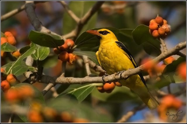 | A contented Golden Oriole in a fig tree laden with fruit |