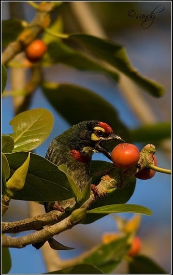 | A Coppersmith Barbet attempts the seemingly impossible |